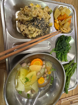 Một nhận định mà ai đến ashram cũng có giống nhau, đó là đồ ăn ở đây đỉnh nóc, kịch trần quá. Mình cũng trải nghiệm đồ chay ở nhiều nơi nhưng có lẽ đồ chay ở ashram là đồ chay ngon và lành mạnh nhất mình từng ăn. Tụi mình ai cũng háo hức chỉ đợi đến giờ cơm trưa hay cơm tối để xem được ăn món gì và chưa có bữa ăn nào làm mình thất vọng (không biết có phải do hao tổn năng lượng quá nên ăn gì cũng ngon không nhưng thật sự là ngon thật vì mình có xin công thức mà không được cho haha). Buổi sáng mình chỉ được ăn cháo nhẹ vì ngay sau đó là tập Yoga nên bụng cần nhẹ, nhiều anh chị nhịn bữa sáng cho đúng truyền thống nhưng mình thì cần ăn một chút. Buổi tối nếu hôm đó có sinh nhật ai, tụi mình vớ bở được ăn bánh ngọt chay, chu cha ngon ơi là ngon. Vậy mà khi về lại Sài Gòn mình không tăng cân miếng nào haha.